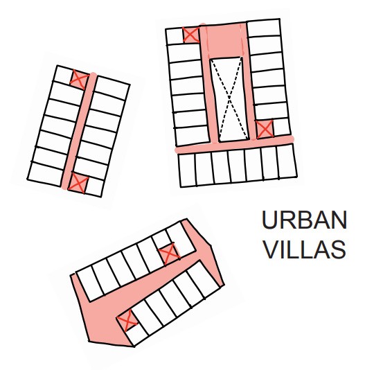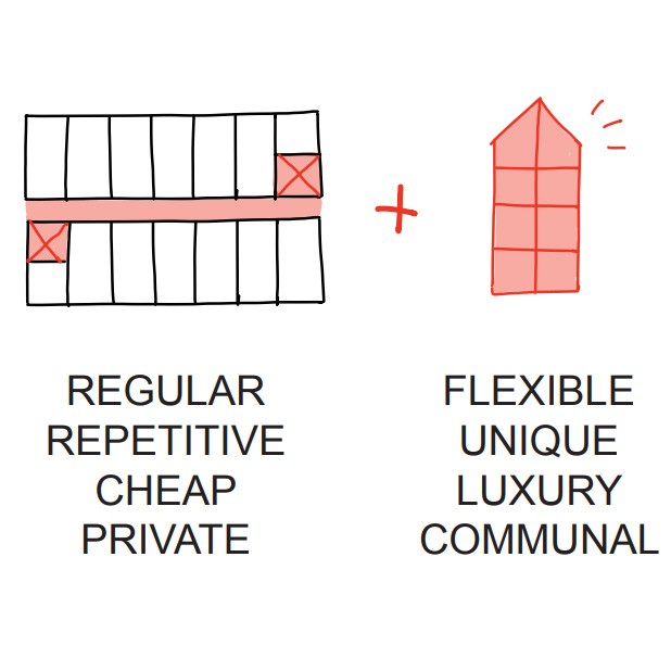 Het prototype kan worden aangepast aan de meest uiteenlopende bouwmorfologie en ontsluitingschema's. De simpelste versie is eenvoudig gemaakt van een gedeelde plint en 3/4 verdiepingen met 15/20 appartementen en een plat dak. De ideale configuratie is een gebouw dat 30/40 eenheden beslaat, verdeeld door een centrale gang die gedeelde ruimtes omhelst, met een schuin dak. In andere variaties kunnen de appartementen ook een galerij omhelzen en kan het gebouw worden opgeschaald tot een flatgebouw, of zodat het ook een binnenplaats omvat.