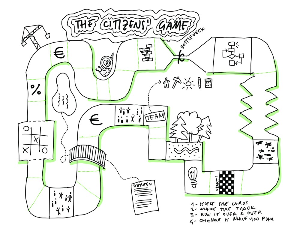 Met het onderzoeksproject The Citizen's Game hebben we een toolbox gecreëerd die gericht is op het verspreiden van kennis van experts aan iedereen die zelf een eigen wooncoöperatie wil ontwikkelen. In samenwerking met alle adviseurs en betrokken woonwcoöperaties hebben we geprobeerd ons voor te stellen hoe een eenvoudig en toegankelijk educatief bordspel ontworpen kon worden. The Citizen’s Game is een bordspel gericht op het maken van een proceskaart waarmee initiatieven kunnen reflecteren op hun ontwikkelingsproces met een leuke maar rijke activiteit.