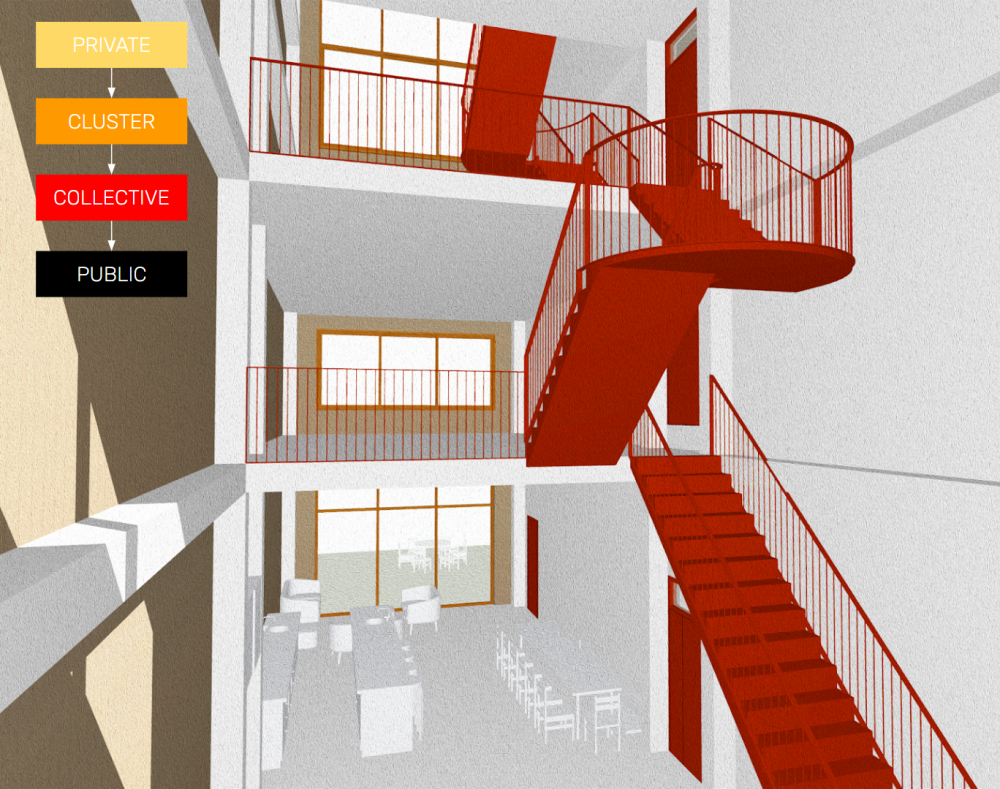 The prototype we designed focuses on affordability and communal living. The name (e)co-system is inspired by ecology, co-housing and system thinking. The flexible residential complex is designed as a co-housing organism where clusters of private apartments ranging from 30m2 to 74m2 share self-determined communal spaces on each floor. Collective semi-public and non-housing functions that are run by the community such as shared laundry, event space, community cafe or a vegetable garden are located at ground floor and open to street life. The private and the collective elements of the building are clearly expressed in the architecture of the building with the apartments being more regular and quiet and the collective spaces more grandiose and outspoken.