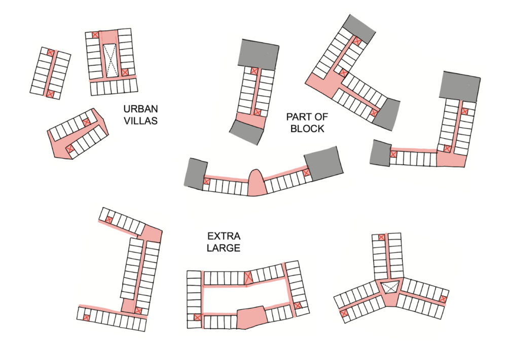 The prototype can be adapted to the most diverse building morphology and distribution schemes. Its minimum version is simply made of a shared plinth and 3/4 levels with 15/20 apartments and a flat roof. The ideal configuration is a 30/40 unit building distributed by a central corridor sharing abundant shared spaces and with a pitched roof. In other variations the apartments can be served by a gallery and the building could be scaled up to make a courtyard block or a slab.