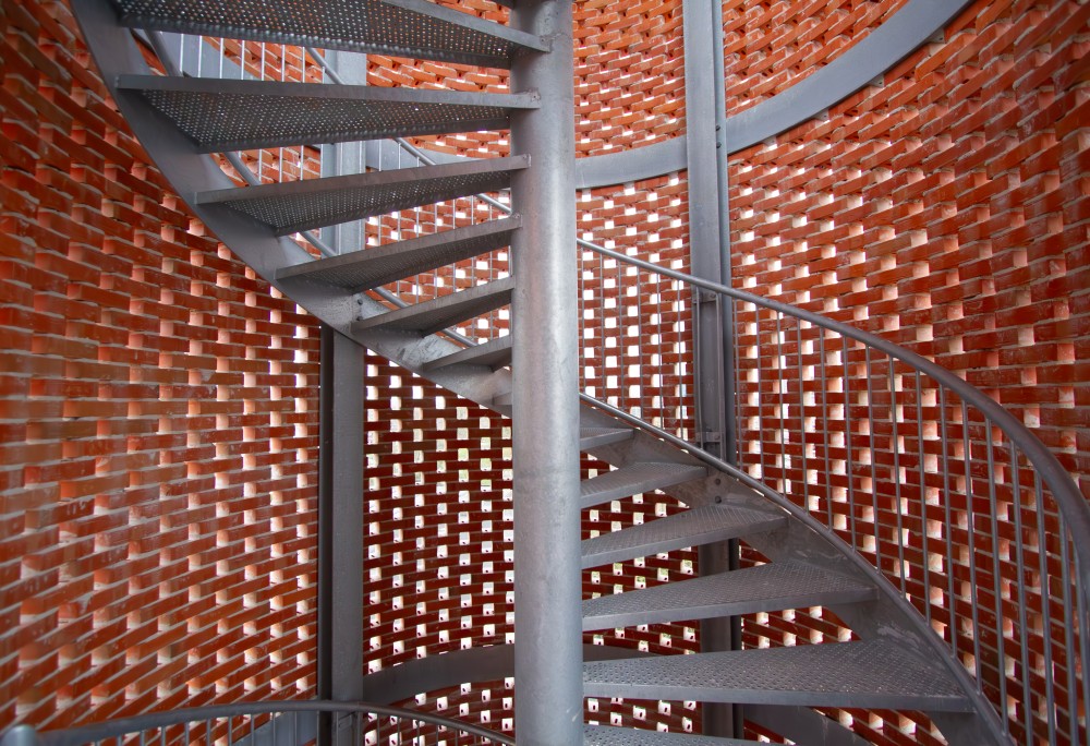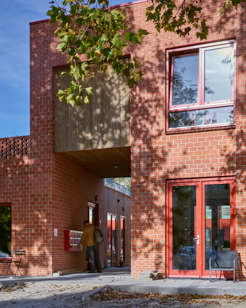 Next to people, the building houses a rich biodiverse ecosystem owing to green areas, rainwater collection, and the integration of bat, bird and insect nests in the brick facade.