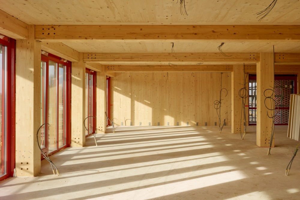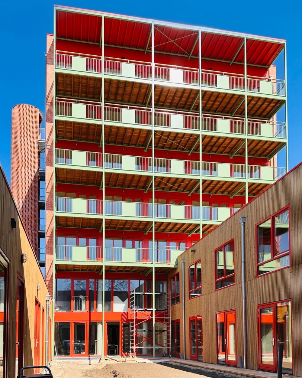 The seven-storey building has a circular load-bearing structure made of cross-laminated timber and facades of prefab timber-framed elements. We use a total of 247.168 Kg of wood. This means 450.000 Kg of CO2 has been subtracted from the atmosphere permanently.